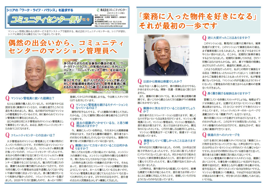第92号では、 松戸エリアのマンションで新人に対して研修講師を務めながら、 管理人業務に携わるさんSさん(75歳)にお話を伺いました。
