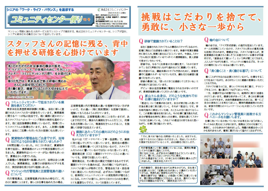 第98号では、 東京本社で新人研修に携わるHさんにお話を伺いしました。長く働く喜び、 健康でいることの大切さを伝えていただいてます。