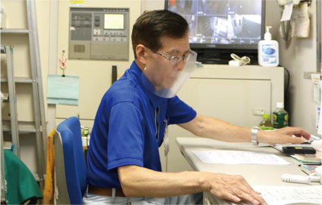 業務中は手製のフェースシールドを使っています。