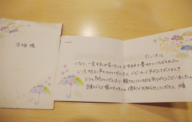 お引越しをされる方から、お礼のお手紙をいただいたことがあります。それを見たときは思わず泣いてしまいましたよ。