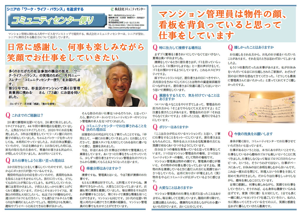 第99号では、神奈川エリアのマンションでスポット代行を中心に管理員業務に携わるSさん(66歳)にお話を伺いました。