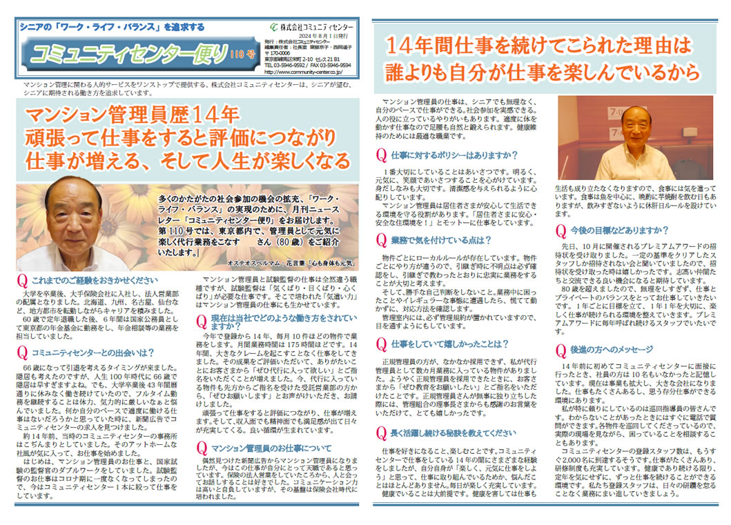 第110号では、 東京都内で、 管理員として元気に楽しく代行業務をこなすKさん (80歳) をご紹介いたします。