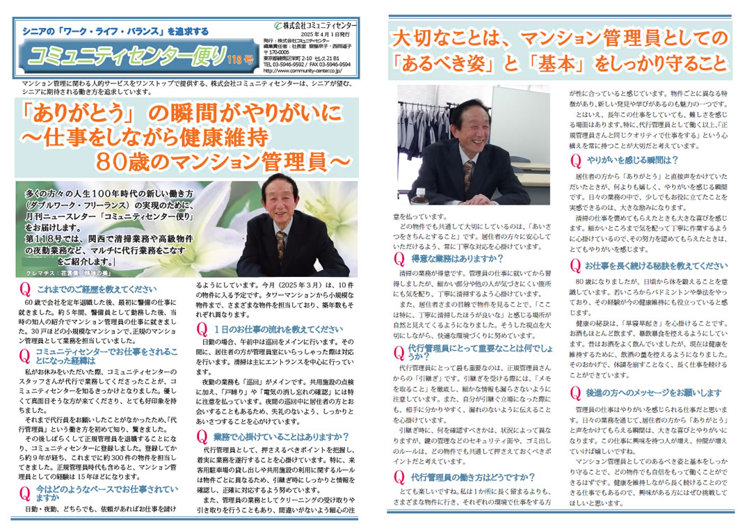 マンション管理員としてのあるべき姿と基本をしっかり守ることで、どの物件でも自信をもって働くことができるはずです。健康を維持しながら長く続けることのできる仕事でもあるので、興味がある方にはぜひ挑戦してほしいと思います。