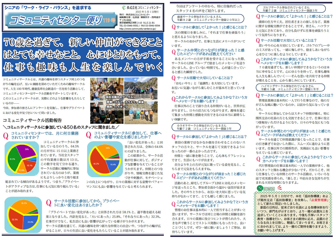 コミュニティサークルとは、共通の趣味を持つスタッフ同士のつながりの輪を広げ、互いに親睦を深めていただくための趣味サークルです。人生100 年時代、健康長寿社会創造の一旦を担う活動として、コミュニティセンターはサークル活動をサポートしています。このコミュニティサークルが、実際にどのような影響をもたらしているのか——