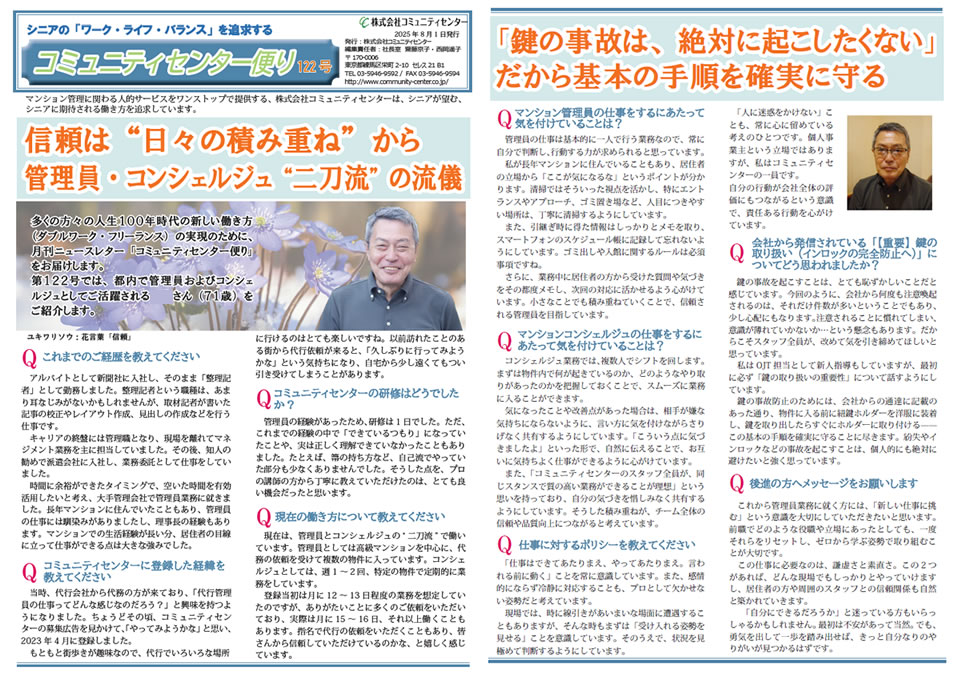 多くの方々の人生100年時代の新しい働き方(ダブルワーク ・ フリーランス) の実現のために、月刊ニュースレター 「コミュニティセンター便り」をお届けします。第122号では、 都内で管理員およびコンシェルジュとしてご活躍されるTさん (71歳) をご紹介します。