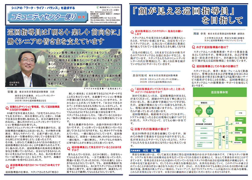 コミュニティセンター便り80号ではコミュニティセンターの東京本社巡回指導課をご紹介しています。当社の1番の強みである巡回指導員の特徴や今後の抱負を語ってもらいました。
