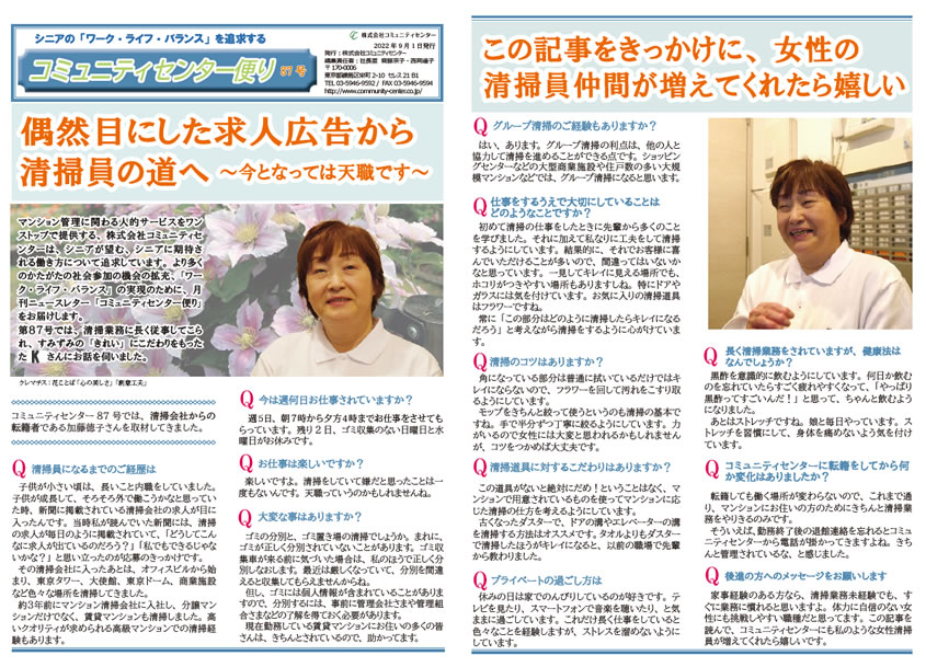 コミュニティセンター87号では、清掃会社からの転籍者であるKさんを取材してきました。