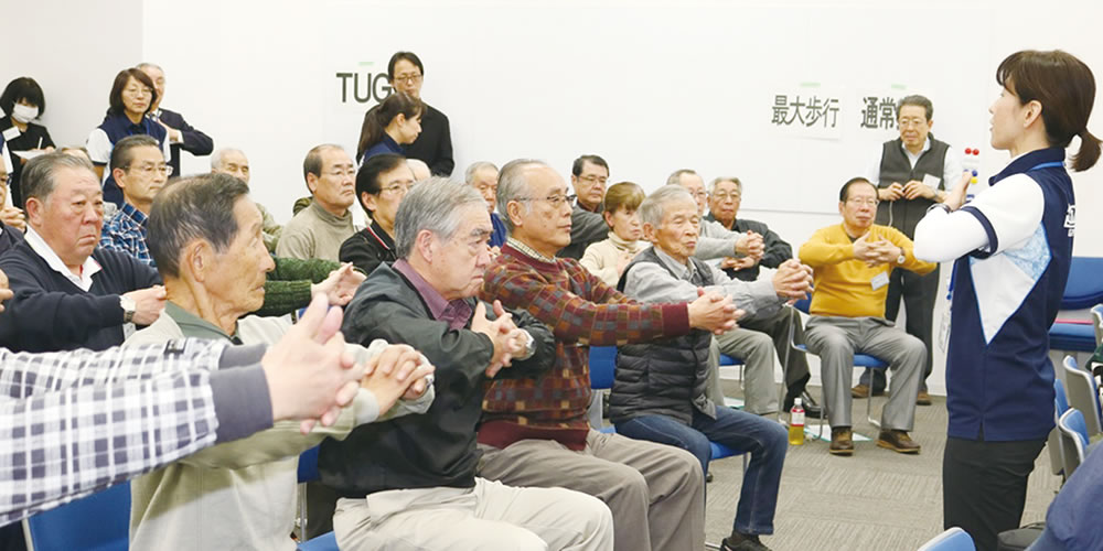 その後、セントラルスポーツ介護予防事業部のリーダーである森敦氏から今回行う体力測定の内容、やり方や測定時の注意事項などについて説明がありました。続いて女性インストラクターの指導の下、全員でウォーミングアップを行った後に受付時に配布された測定用紙を片手に、50人の参加者が測定に移りました。