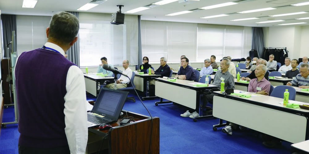 4月 15日(日)午後、かながわ労働プラザ(神奈川県横浜市中区)を会場に、体力測定および現任研修を実施、合計 41人が参加しました。体力測定はスタッフの皆さまに健康で長く仕事をしていただくためのものです。今回の現任研修では、前半は横浜防災士協会から講師を招いて「マンションにおける防災および避難誘導方法」の講習を、後半は人形を使っての「AEDの使い方」と三角巾を使っての「応急手当の方法」などについて学びました。
