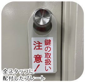 かねてより管理会社さまからお褒めの言葉をいただいております、当社のスタッフ教育については、eラーニング研修やワンポイント清掃動画の配信を継続しており、昨年はドアノブにかけて使用する鍵の「鍵の取扱い注意プレート」を全スタッフに配付いたしました。