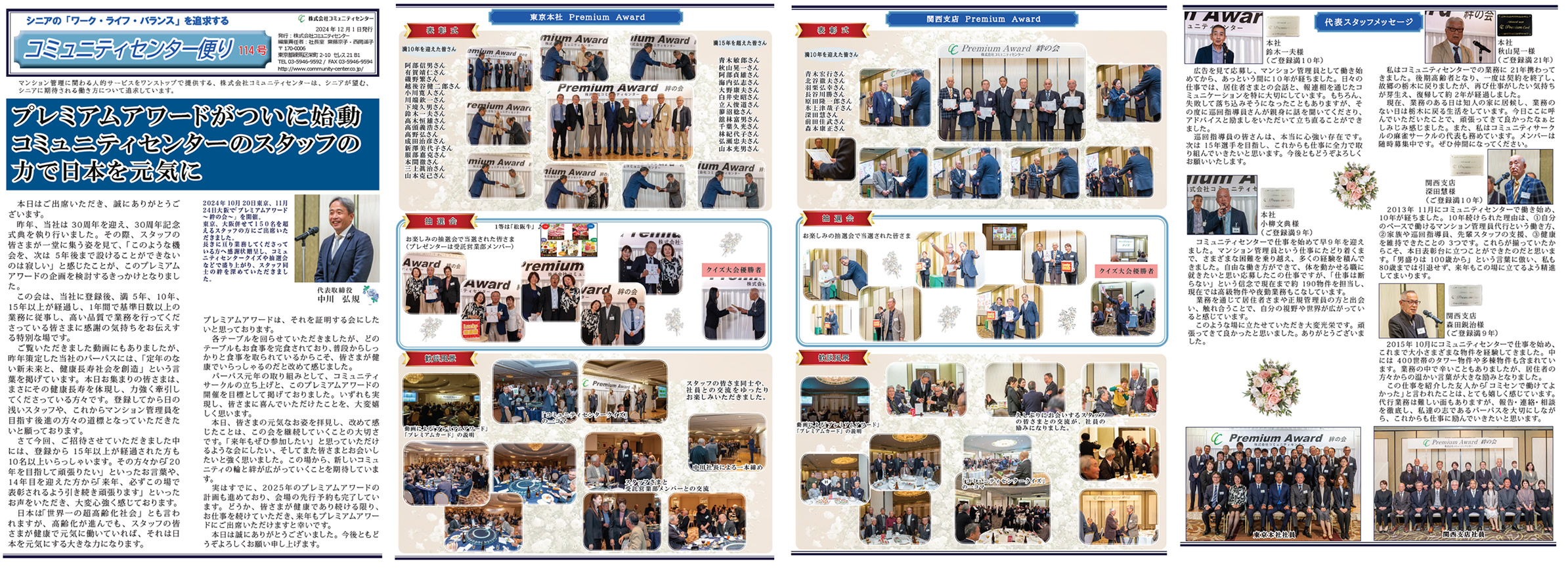 第114号では、 コミュニティセンター30周年記念式典の様子、およびプレミアムアワードの企画について報告いたします。