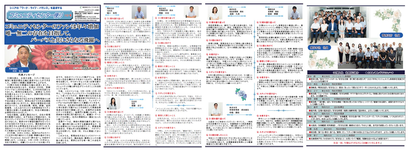 今期も、社員一人ひとりが成長を重ね、お客さま、スタッフの皆さまにとって欠かせない存在となるため、誠実な業務に努めてまいります。毎月お届けしている「コミュニティセンター便り」では、当社で活躍するスタッフの皆さまを紹介してまいります。