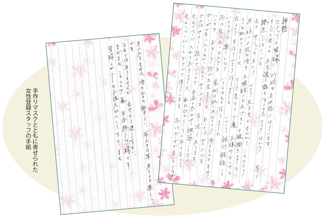 そのスタッフは、そのことをきっかけに自身もいろいろな工夫をして作ってみたという手作りのマスクを手紙とともに送ってきてくれました。